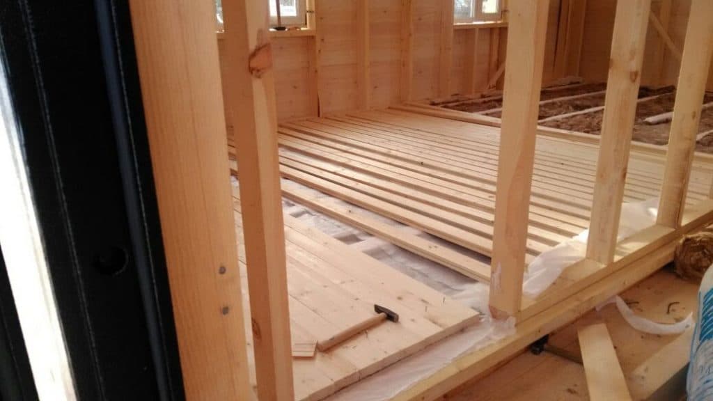 В случае строительства по канадской технологии настил по лагам может осуществляться готовыми СИП-панелями заводского производства. В этом случае черновой настил не нужен. Панели соединяются между собой по методу шипа и паза, швы герметизируются монтажной пеной или герметиком (в некоторых случаях перед укладкой напольных панелей на лаги наносят мастику).