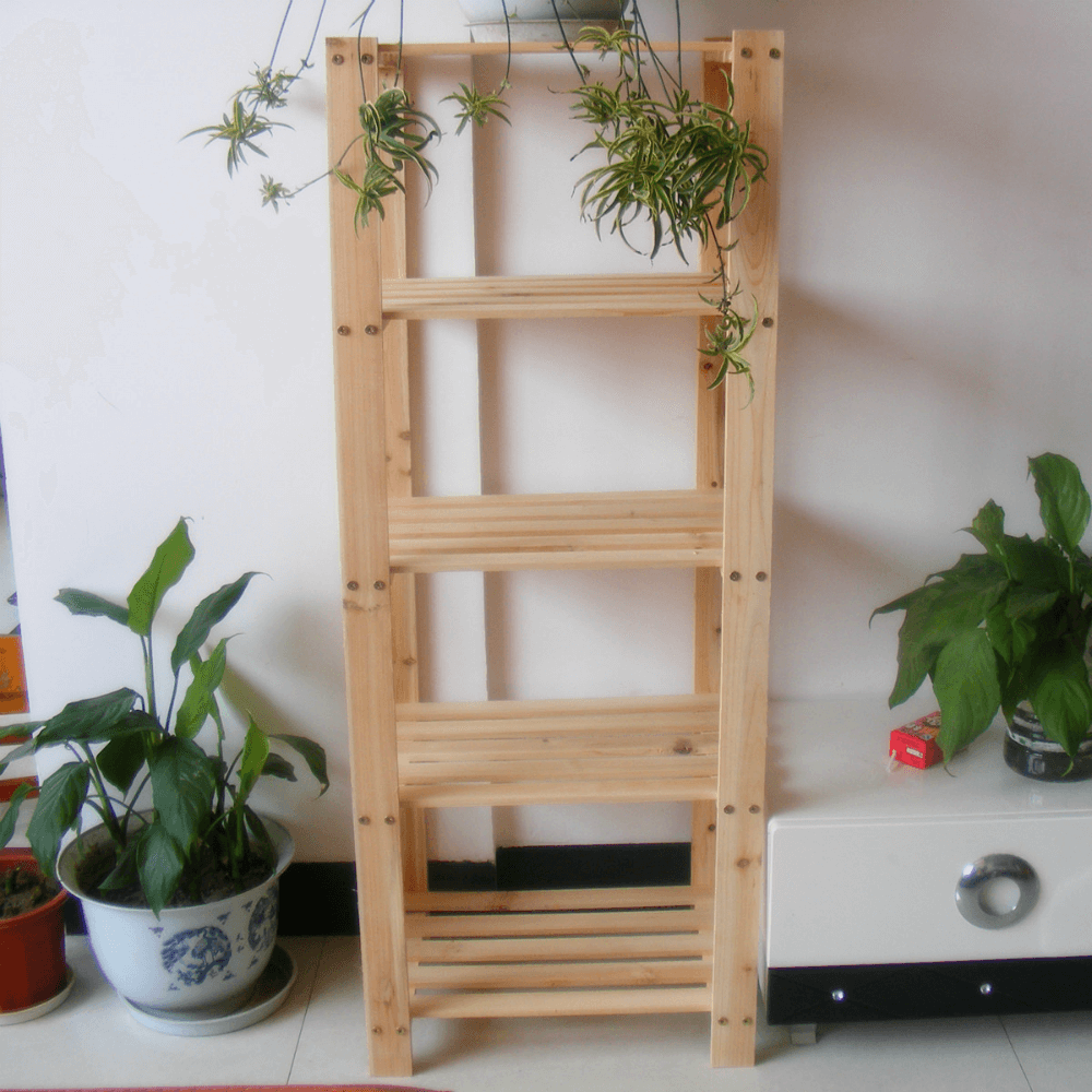 Цветы можно поставить на подвешиваемую полку. В этом случае крепление выполняют тросами, кронштейнами, цепями и другими способами. Однако рассчитывать на серьезную нагрузку точно не приходится. Стандартным и привычным вполне решением оказывается настенная цветочная полка. Ее прикрепляют с помощью кронштейнов, саморезов (иногда в ход идут и петли). Но по устойчивости и безопасности нет равных напольным конструкциям.