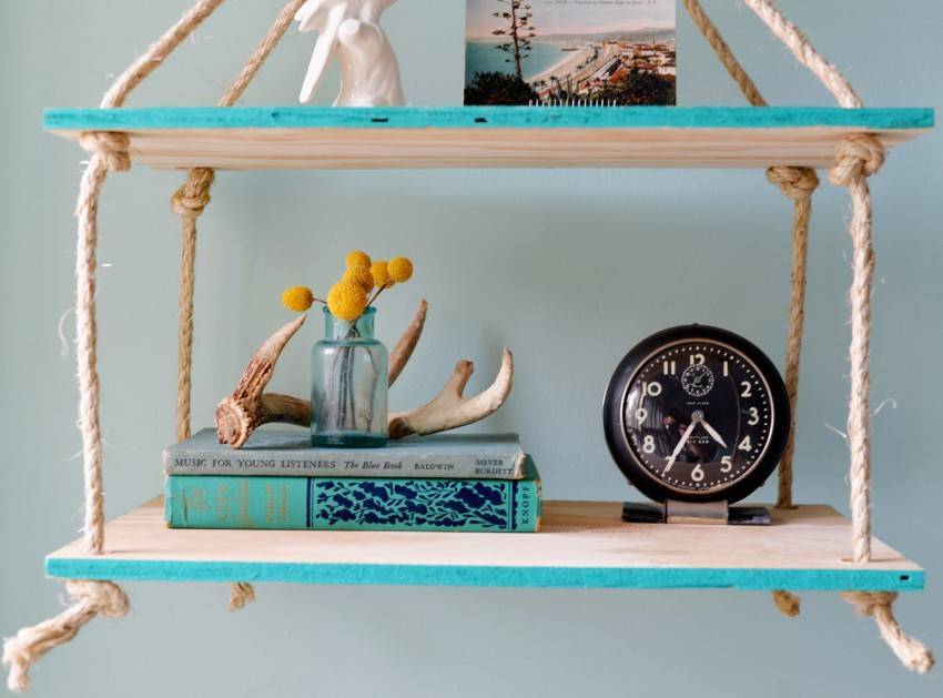 Если имеются боковые верёвки, тогда на ней хранят книжки. Итак, делаем полку своими руками, вот материалы, которые пригодятся: 4 доски толщиной 2,5, а длина на выбор, верёвка толщиной 8 мм и длиной 4 м, дрель со сверлом 10 мм, 2 крюка из стали, дюбеля d- 8 мм, перфоратор.