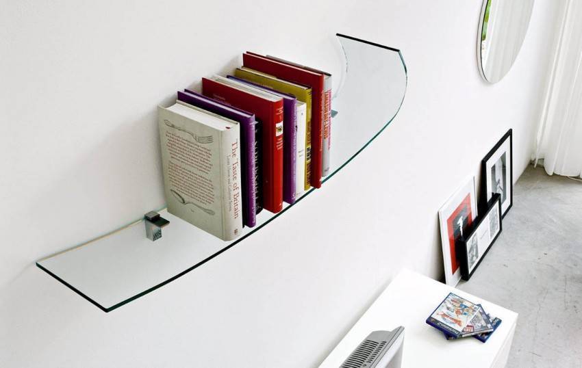 Так же как и пластик, современный материал, который начал использоваться для изготовления книжных полок лишь недавно. Отличный выбор для любителей минимализма в интерьере.