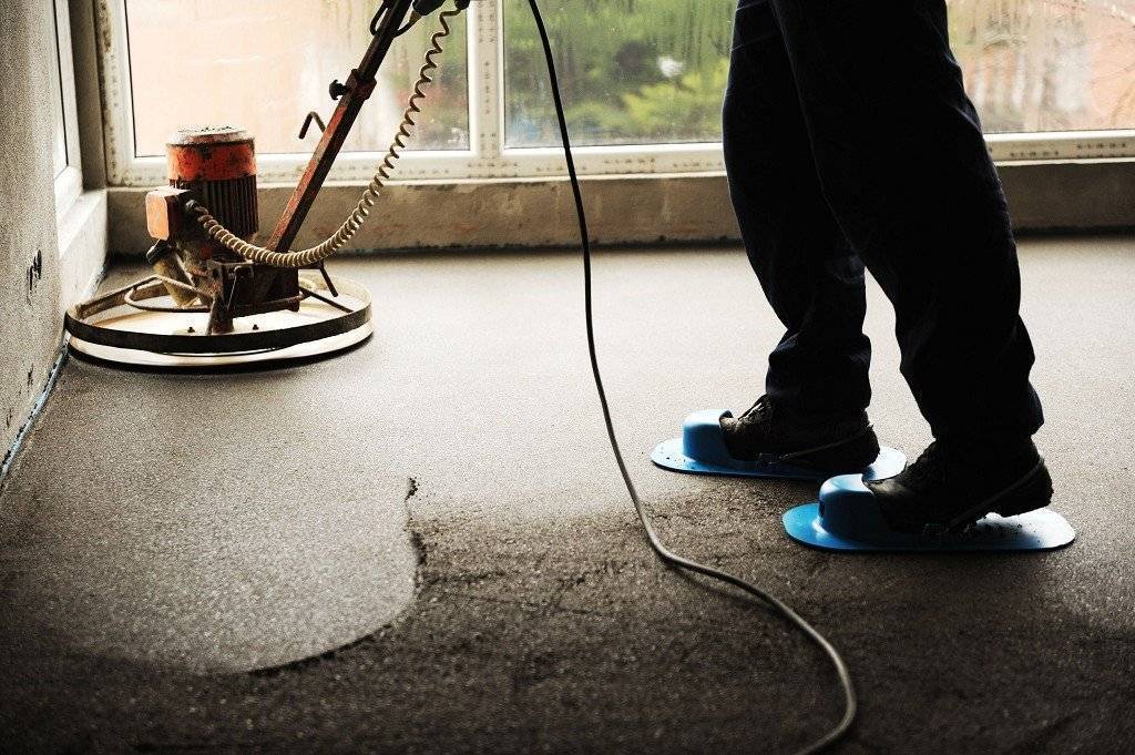- Одним из последних этапов являются затирка и шлифование. Именно благодаря им можно получить идеально ровное покрытие. После того как стяжка затвердевает, нужно сбить бугры, для этого используется металлическая стяжка. Потом поверхность нужно отшлифовать специальной шлифовальной машинкой.