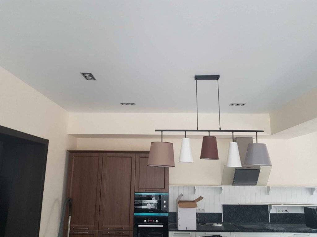 Верхние шкафчики, доходящие до потолка, привлекают к нему повышенное внимание. Чтобы дорогой гарнитур по-настоящему украсил кухню, нужно убрать все неровности, продумать цвет и текстуру потолка