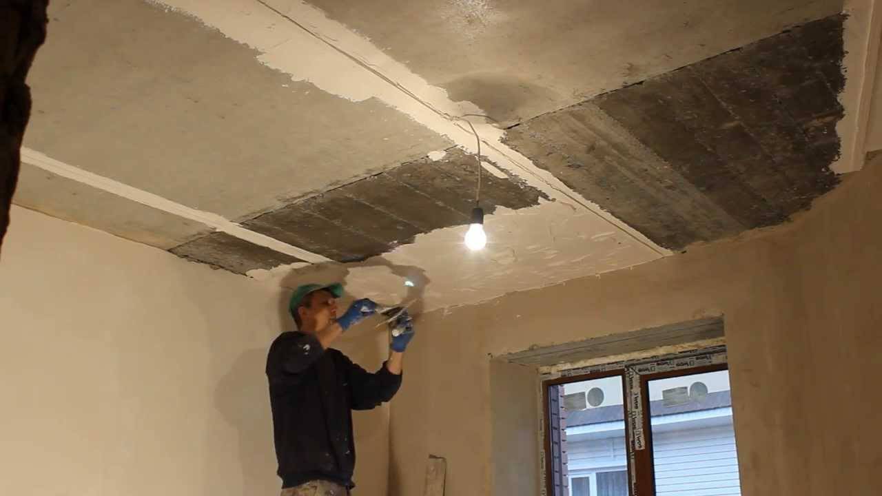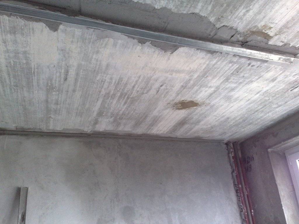 - Потолок очищают от старого покрытия. При этом тщательной очистки совсем не требуется, достаточно снять отклеивающиеся обои и удалить осыпающуюся штукатурку.