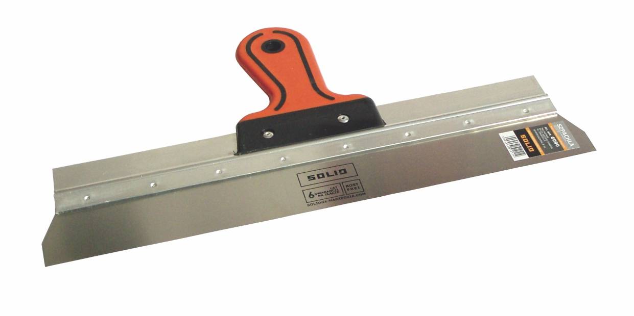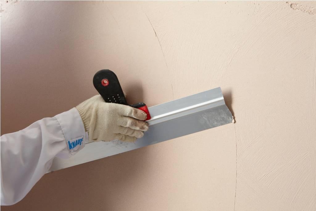 Для этой цели используют широкий фасадный шпатель с шириной лезвия 45-60 см. С легким нажимом его перемещают по участкам между маяками, стараясь избежать образования волн.