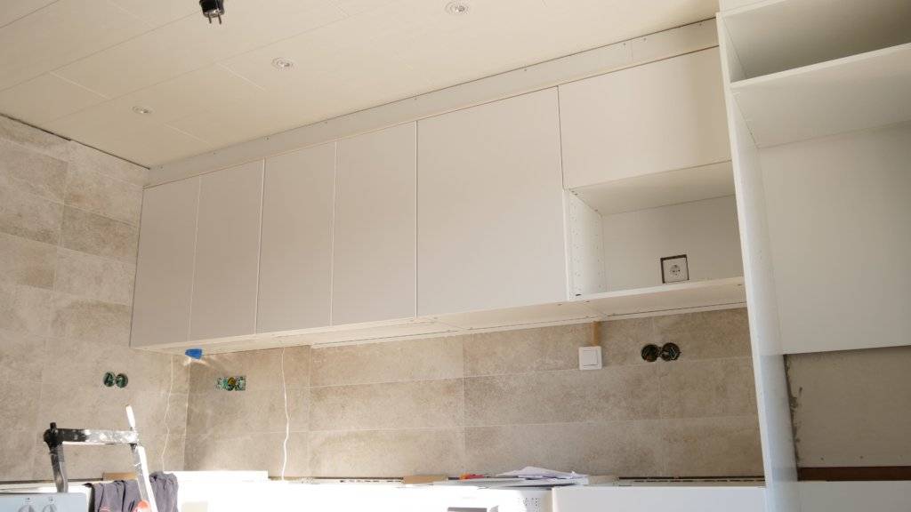 Зазоры между потолках и верхней секцией кухни, если таковые есть, закрываются карнизом или фальшь-планкой. Они монтируются после установки гарнитура и придают кухне законченный вид. Карниз не только украшает кухню, но и защищает ее от пыли: она не попадает в узкие щели над подвесными шкафами.