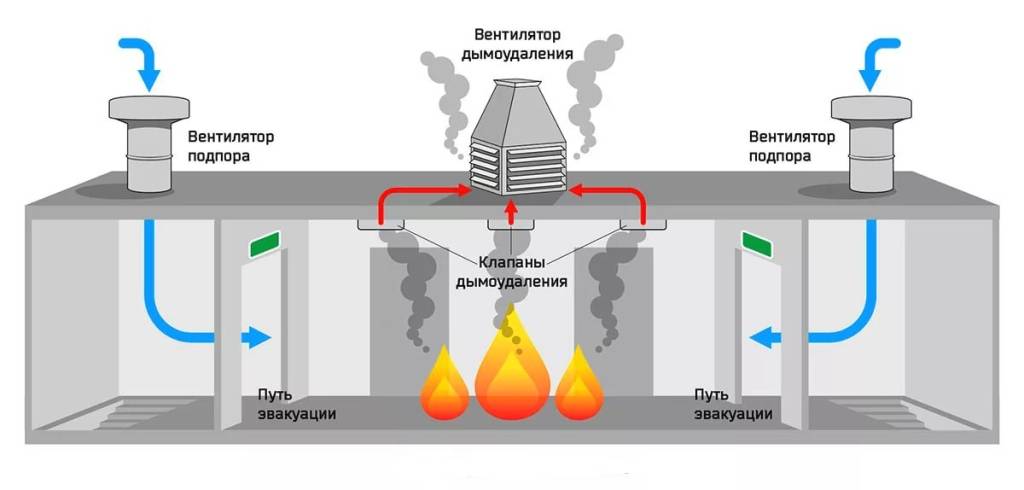 - Удаление дыма для безопасного вывода людей и работ специальных служб пожаротушения.