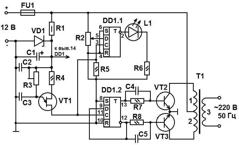 Генератор, собранный на транзисторе VT1, генерирует колебания с частотой 100 Гц, частоту можно регулировать подстроечным резистором R3. Триггер DD1.2 делит частоту пополам и на выходах 12 и 13 триггера образуются противоположно направленные по амплитуде импульсы с частотой 50Гц. Импульсы попеременно открывают транзисторы VT2 и VT3, которые включены по схеме двухтактного усилителя мощности. Нагрузкой транзисторов VT1, VT2 являются обмотки 1 и2 повышающего трансформатора Т1, на вторичной обмотке 3 которого и образуется переменное напряжение 220В, 50 Гц.