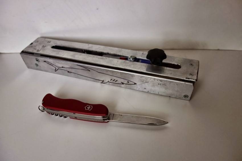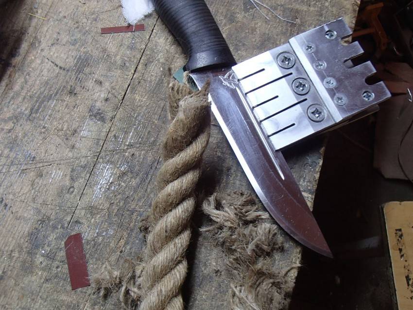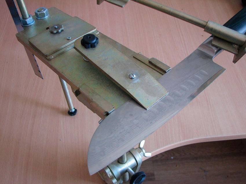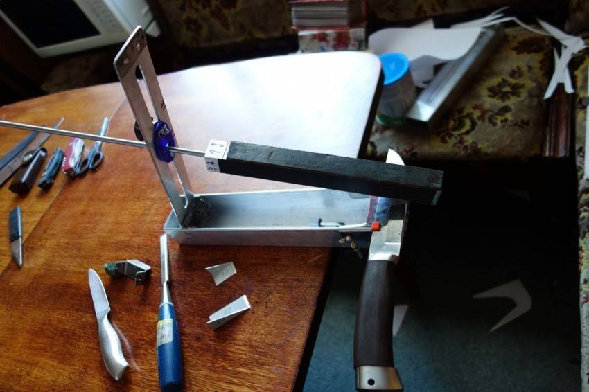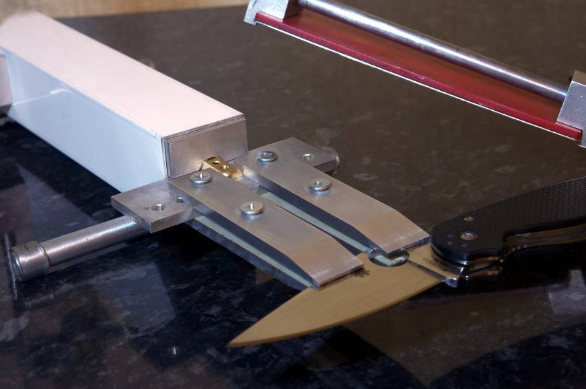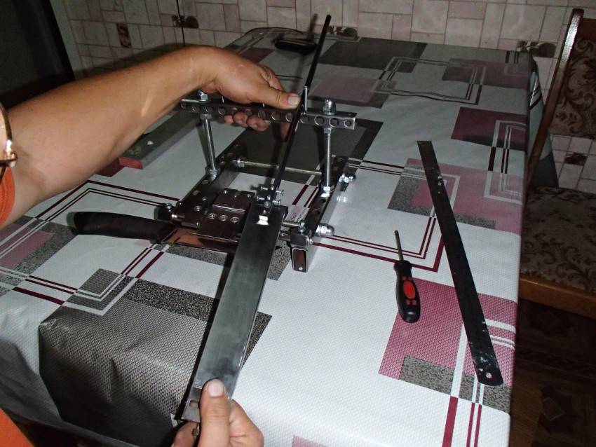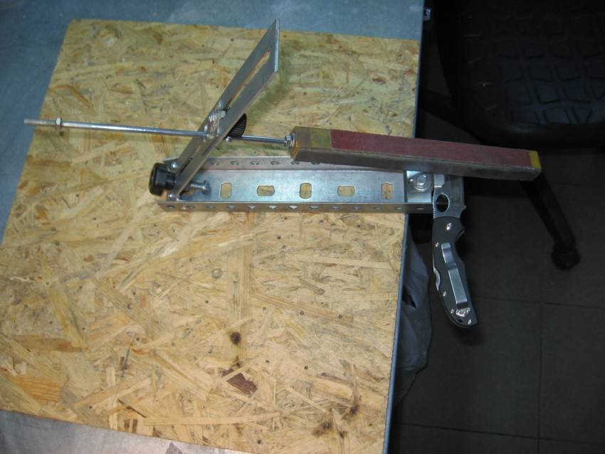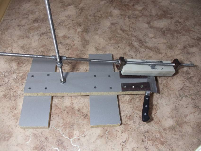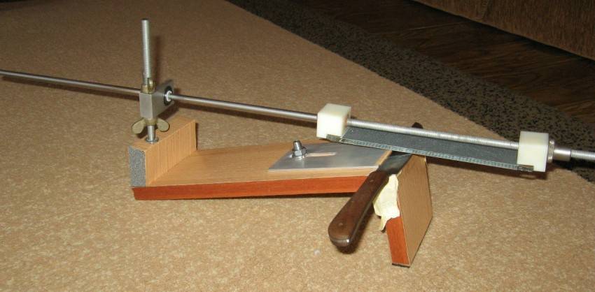 Изготовление самодельного приспособления для заточки ножей можно считать законченным. Достаточно выставить нужный угол, медленно плавным движением по все длине лезвия затачивать кромку.