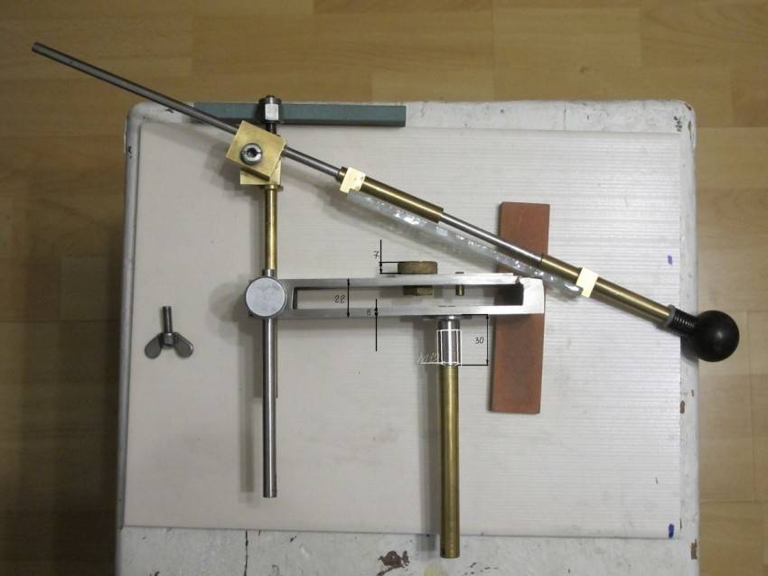 Оселок соединить с направляющим штоком, в качестве которого выступает стальной стержень с сечением 8 мм. При соединении оселка и направляющего штока следует строго следить за тем, чтобы их осевые линии совпадали. При желании, для удобства пользования точилкой, к оселку с обратной стороны можно приспособить ручку-держатель. Осталось закрепить оселок в направляющем механизме, зафиксировать барашком и самодельное приспособление для заточки ножей готово.