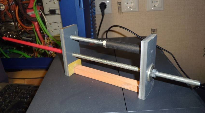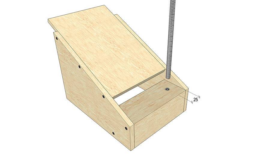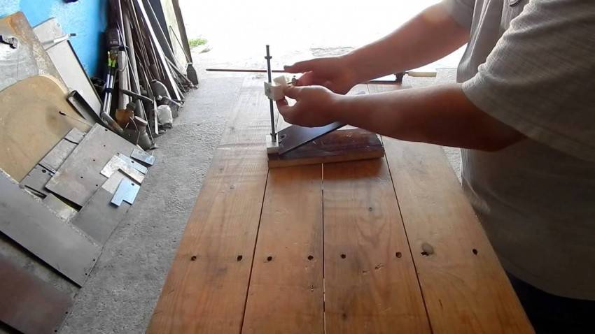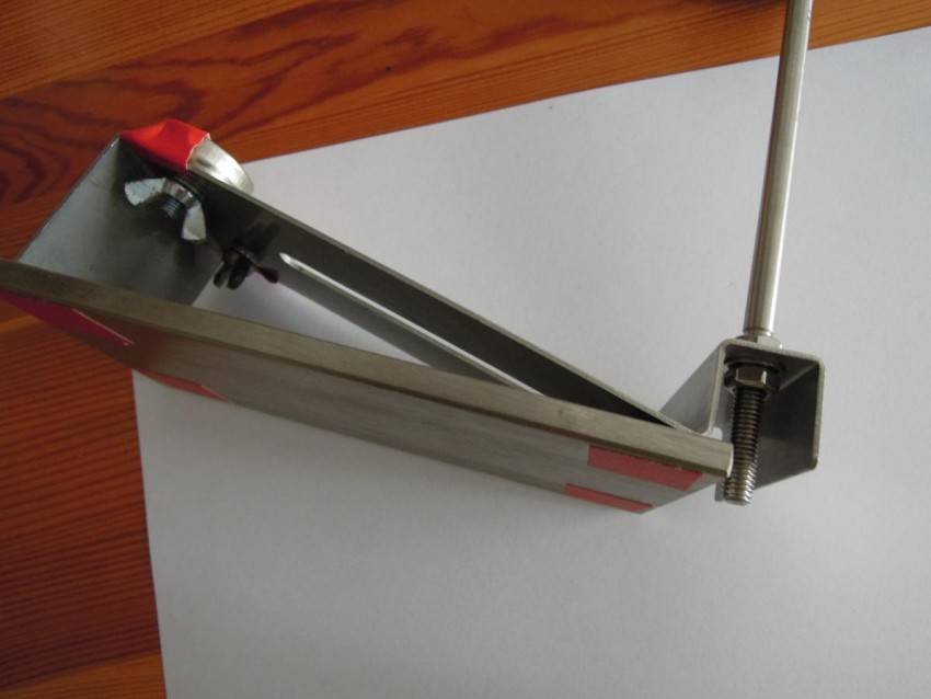 После подготовки и укомплектования материалами можно приступать к процессу сборки приспособления. В первую очередь берем фанеру для использования в качестве станины, которая должна опираться на крепежные ножные под определенным углов в диапазоне от 15 до 20 градусов. После этого в нижнюю часть, закручивается подготовленная нами шпилька, ее длина должна составлять примерно 35-40 см. Чтобы посадочную резьбу сделать более прочной можно использовать клей или герметик.