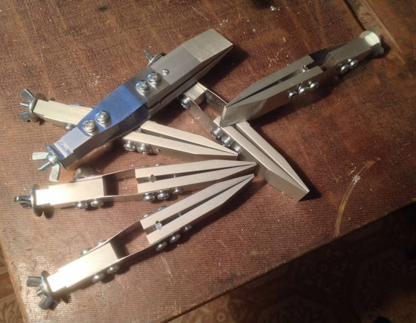 - Углеродистая нержавеющая сталь толщиной 3-5 мм для зажимов. В них делают сквозные отверстия. Совет: машинное масло облегчит сверление пазов в пластинах. Отмыть масло можно концентрированным раствором из остатков мыла.