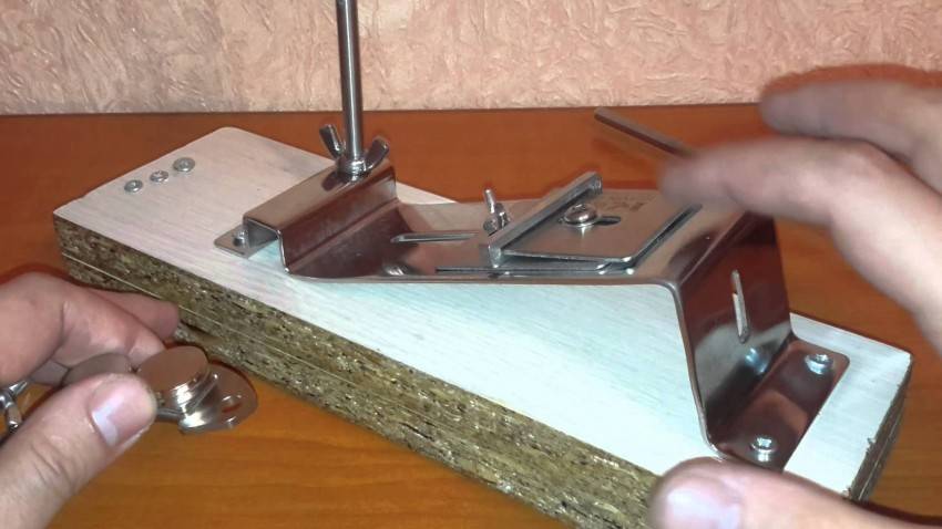 Вторая часть работы заключена в сборе зажимающего устройства для фиксации положения ножа. Для этого к бруску из дерева 245*92 мм тремя саморезами крепится рояльная петля с торца деревянной пластины, при помощи которой она будет крепиться к основанию приспособления.