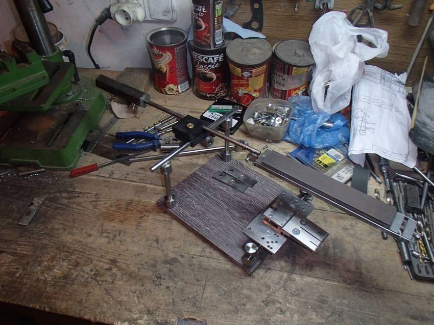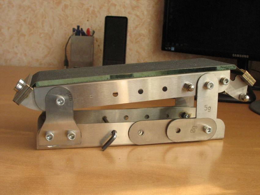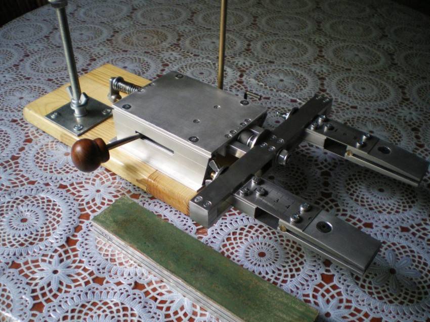 Все самодельные устройства для заточки ножей помогают точно выдержать заданный угол наклона бруска к лезвию, что важно для сохранения работоспособности инструмента и получения хорошей режущей кромки клинка. Простым для самостоятельной сборки является станок по проекту Лански