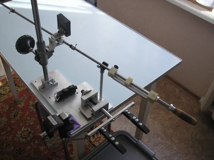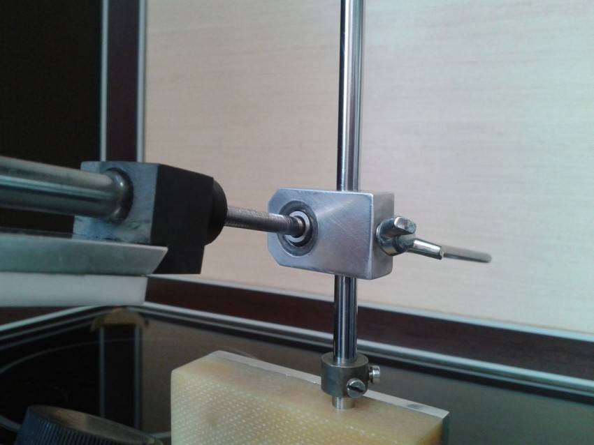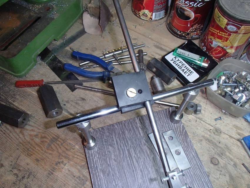 Главная конструкционная особенность — это наличие шарнира, обладающего двойной степенью свободы. Такое устройство можно легко собрать, использовав для этого одинаковые бруски текстолита. Один из них должен накручиваться на резьбу вертикальной шпильки, и использоваться как горизонтальная поворотная ось и регулятор высоты для рычажной опоры (это необходимо для установки заточного угла).