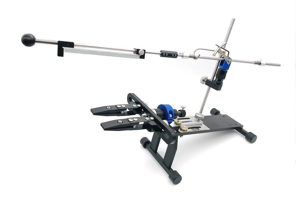 Принцип работы прибора станок Лански состоит в том, что нож надежно фиксируется и его обработка происходит под заданным углом при помощи сменных точильных насадок из камня разной зернистости. Результат – острая кромка клинка.