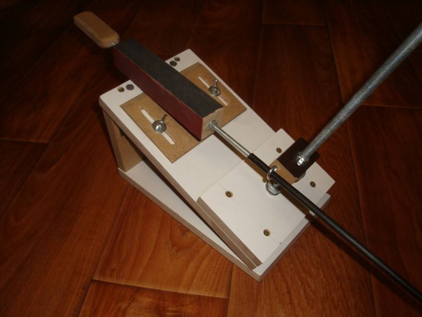 - Простое устройство для домашнего затачивания можно сделать из двух треугольников из дерева. Их ставят параллельно друг другу и соединяют винтами-барашками. Точильный брусок фиксируется между деревянными опорами под углом, который при желании можно поменять. Требуемый наклон абразива легко выставить с помощью транспортира или программы на планшете.