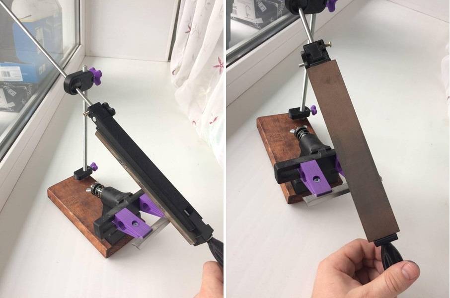Приспособление же фиксирует угол заточки, поэтому точить нож специальным инструментом намного легче, чем бруском.