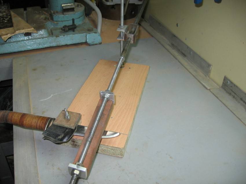 После закрепления деревянной части удерживающего устройства, можно приступить к прикреплению железной пластины. В центе пластины 200*65 мм нужно просверлить продолговатый паз, длиной 90 мм и шириной около 1 см. Паз должен располагаться от края зажимной пластины на расстоянии 60 мм. Дополнительно требуется просверлить отверстие на расстоянии 20 мм от противоположного края и нарезать в нём резьбу под болт М8. Затем нужно прикрепить при помощи этого болта зажимную пластину на подготовленное ранее деревянное основание. При помощи ещё одного болта и подходящей шайбы необходимо зафиксировать зажимную пластину по центру вырезанного паза. Фиксация должна быть чёткой, но при этом аккуратной, чтобы не повредить поверхность клинка.