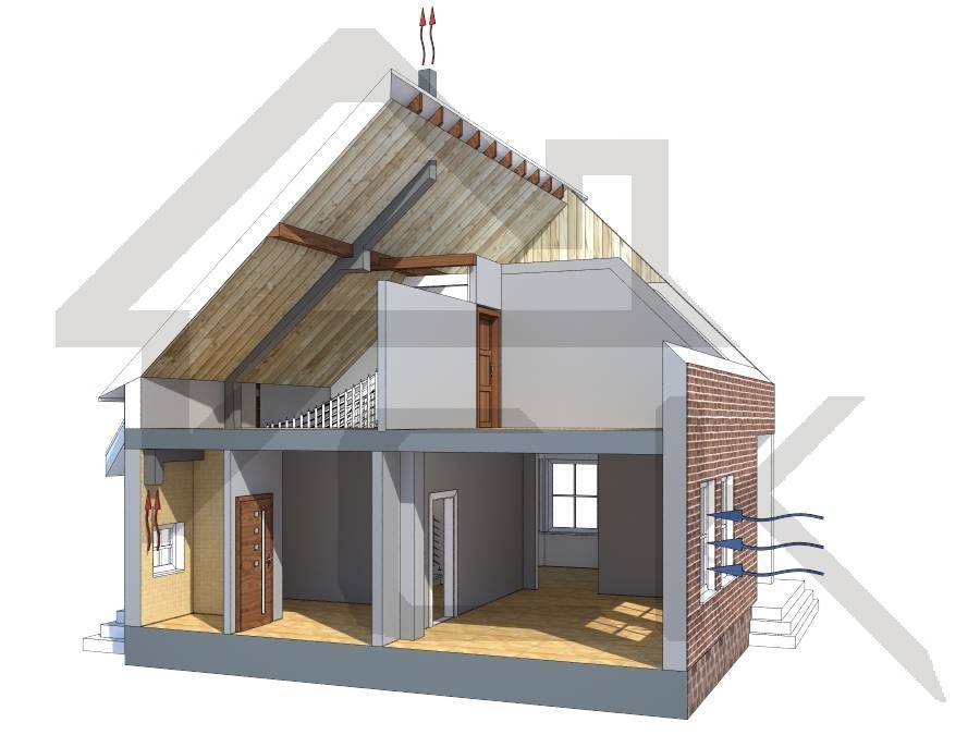 Проектирование вентиляции в частном доме, прежде всего, зависит от используемого при строительстве короба материала. Если применяется сруб или гладкая доска, а отопление печного типа, то нет необходимости в дополнительном оборудовании (с учётом небольшой площади жилья), так как основная система циркуляции воздушных потоков – естественная.