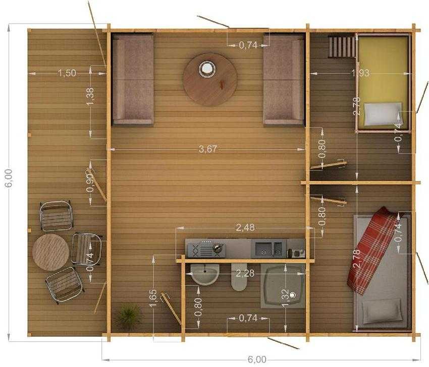 Компактный и небольшой дачный домик 6х6 кв. м включает в себя все необходимое: гостиную, спальню, кухню, ванную и туалет. Такой проект подразумевает, что вы получите не 36, а как минимум 50 кв. м полезной площади. А если этого будет недостаточно, то всегда можно сделать пристройку или переделать имеющуюся террасу под жилое помещение. По центру располагают гостиную с выходом в кухню, а раздельные спальни для взрослых и детей – в мансардном этаже.