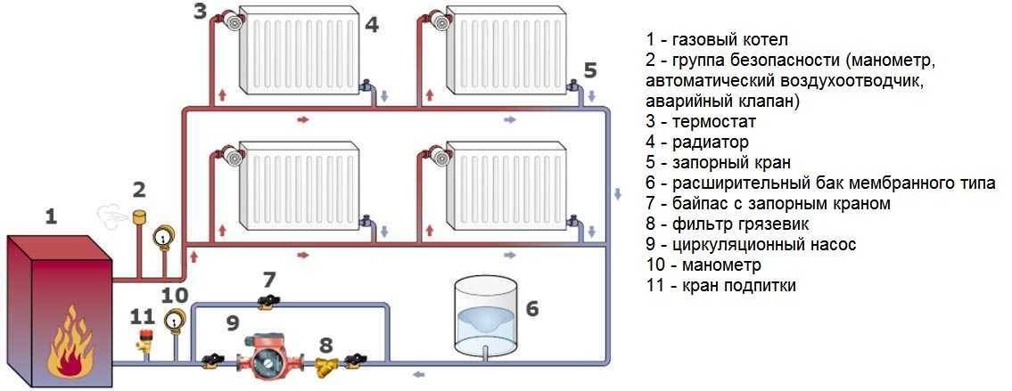 Типовая схема отопительной системы в двухэтажном доме показывает расположение главного оборудования для отопления: котла (твердотопливного, газового, электрического), мембранного расширительного бака и циркуляционного насоса. Для того чтобы защитить насос от перегрузки, выполняется монтаж байпаса с перепускным клапаном.