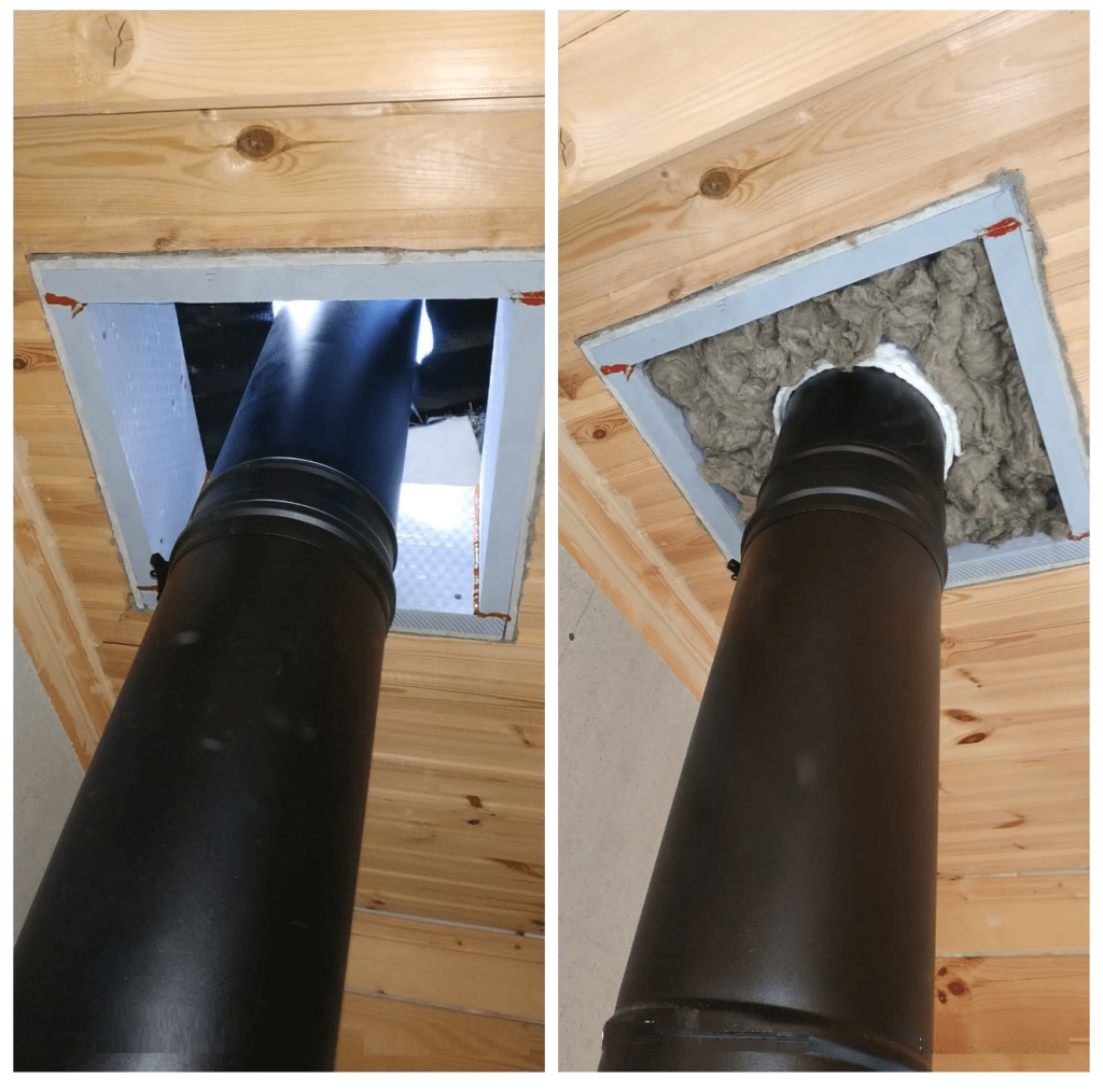 - Абсолютно четко без малейшего зазора подобрать отверстия в коробе под печную трубу практически нереально, хотя бы небольшой зазор, но все же будет. Вот его положено замазать жаропрочным герметиком;