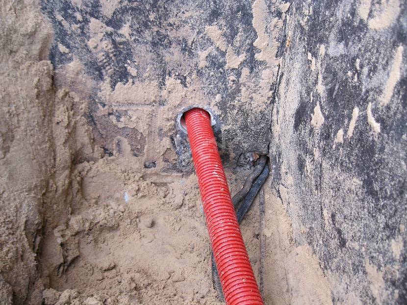 Если в доме есть подвал на ленточном фундаменте необходимо сделать дырку, в которую будет замурован кусок металлической трубы. При этом края трубы должны слегка выступать над уровнем фундамента. В данную трубу будут проведены кабеля, а оставшееся пространство требуется герметизировать.