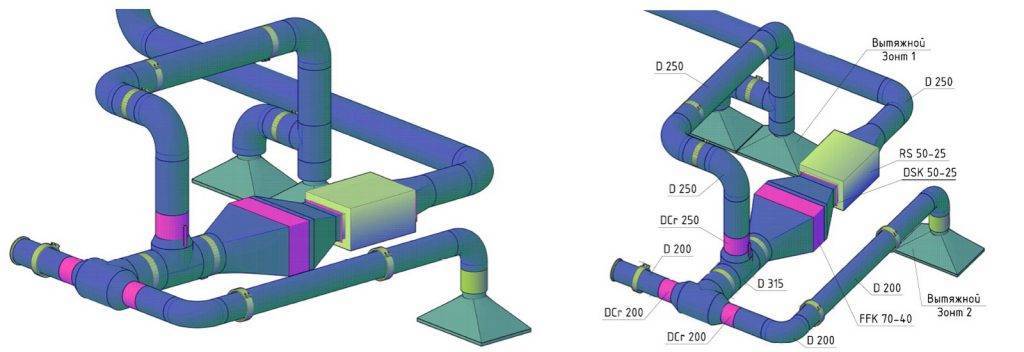 - После завершения всех расчётов, подготавливается принципиальная схема, на основании которой и будет формироваться итоговое тз. Основная схема разделяется на несколько отдельных, ориентируясь на нормативные документы, возможность применения клапанов разделения. Данный шаг необходим для того, чтобы нивелировать опасность быстрого распространения огня по воздуховодам при пожаре.