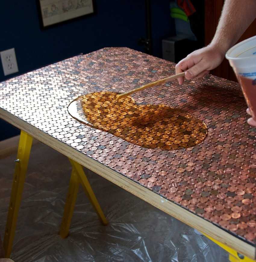 Готовый стол из эпоксидки будет радовать хозяев долгие годы. Но в жизни возможно всякое, и порой из-за негативного воздействия факторов эпоксидные столы приходится обновлять. А при включении фантазии и сделать новым эксклюзивным элементом дизайна, добавив к декору фото, различные бусины, стразы, монетки и пр. Сама работа заключается в следующих этапах: