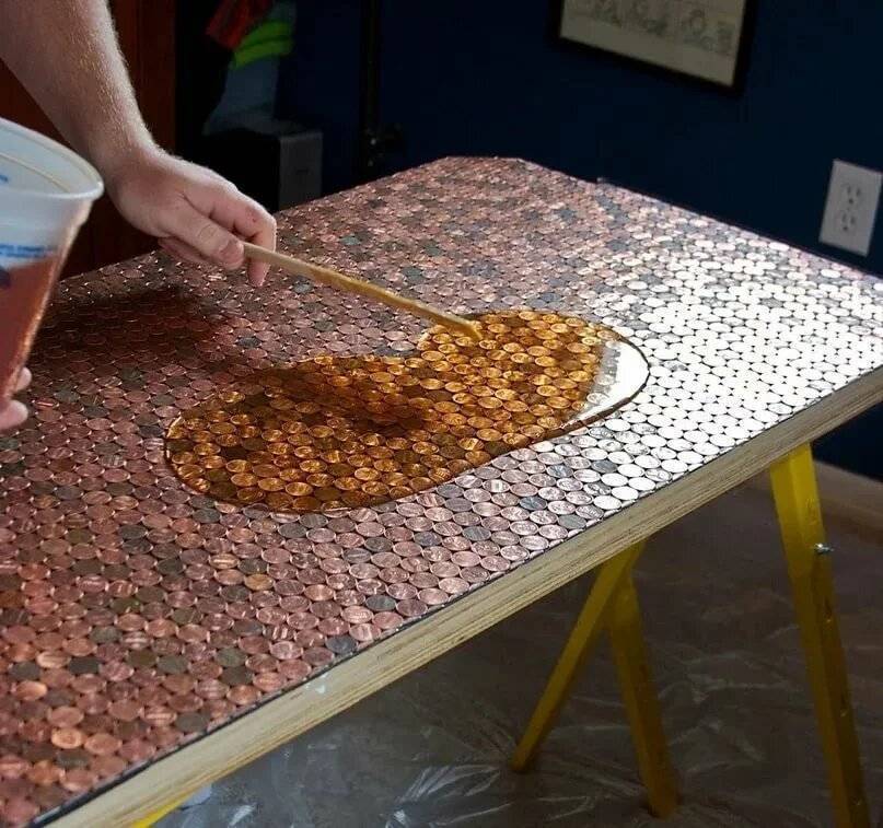Готовый стол из эпоксидки будет радовать хозяев долгие годы. Но в жизни возможно всякое, и порой из-за негативного воздействия факторов эпоксидные столы приходится обновлять. А при включении фантазии и сделать новым эксклюзивным элементом дизайна, добавив к декору фото, различные бусины, стразы, монетки и пр. Сама работа заключается в следующих этапах:
