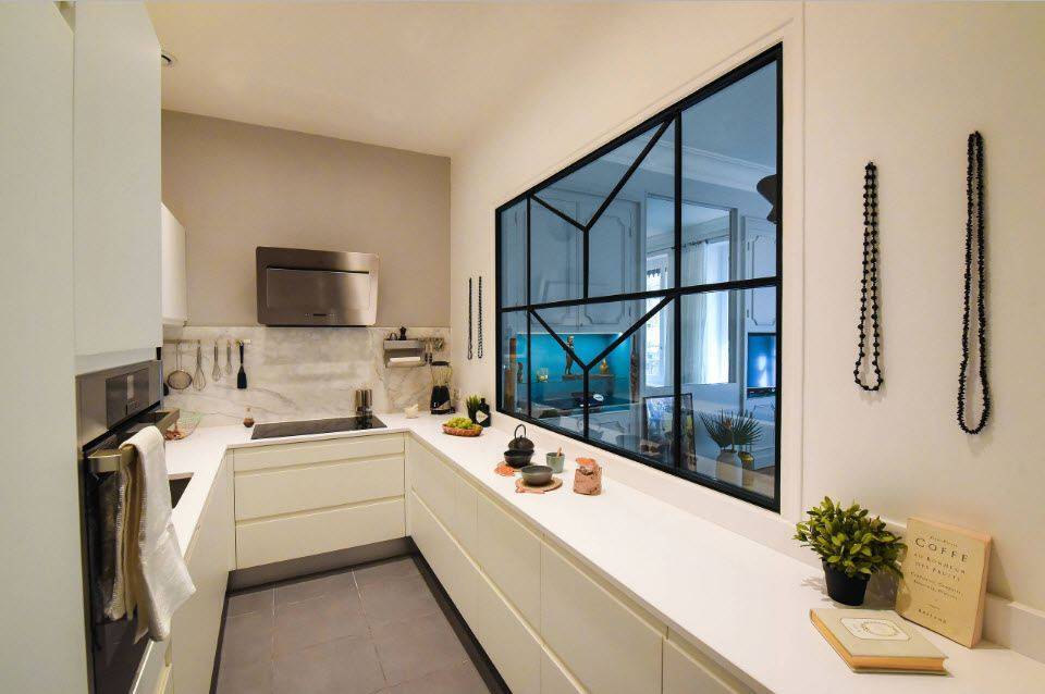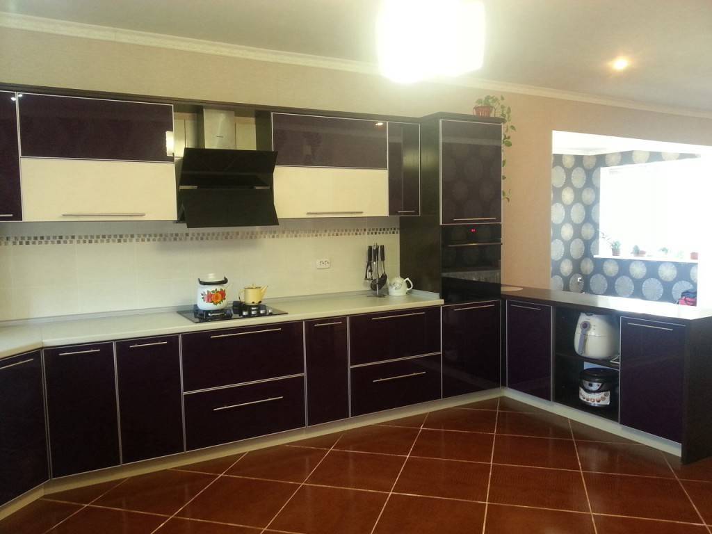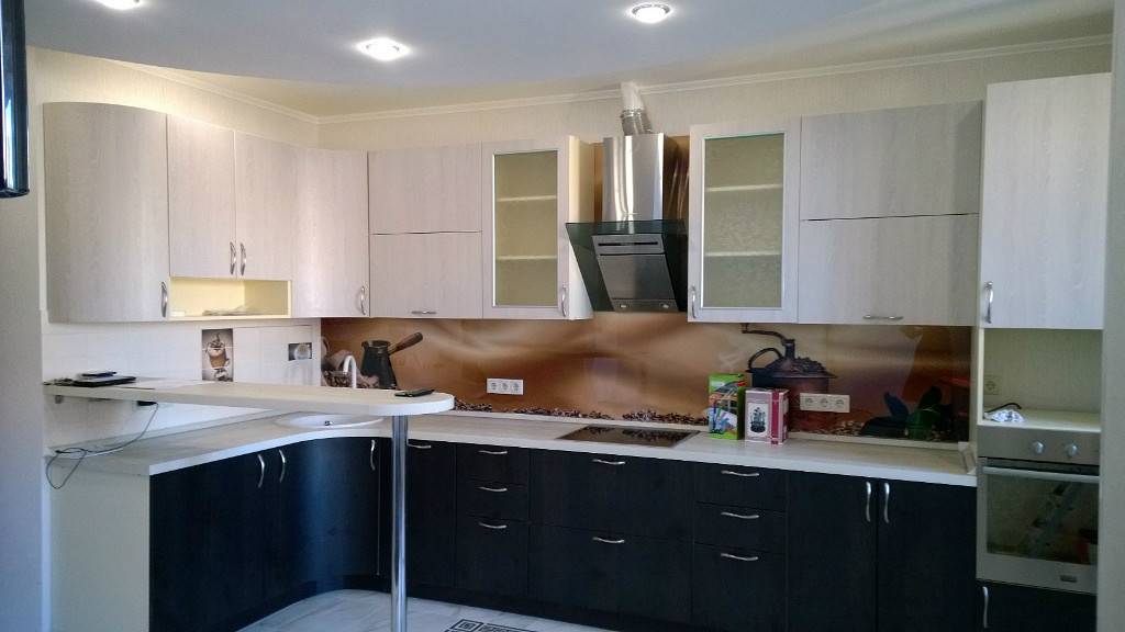 Стороны могут отличаться по длине, если позволяет место, к одной из них можно присоединить барную стойку, получив полуостров. Стойка позволит отгородить пространство кухни от остального помещения.
