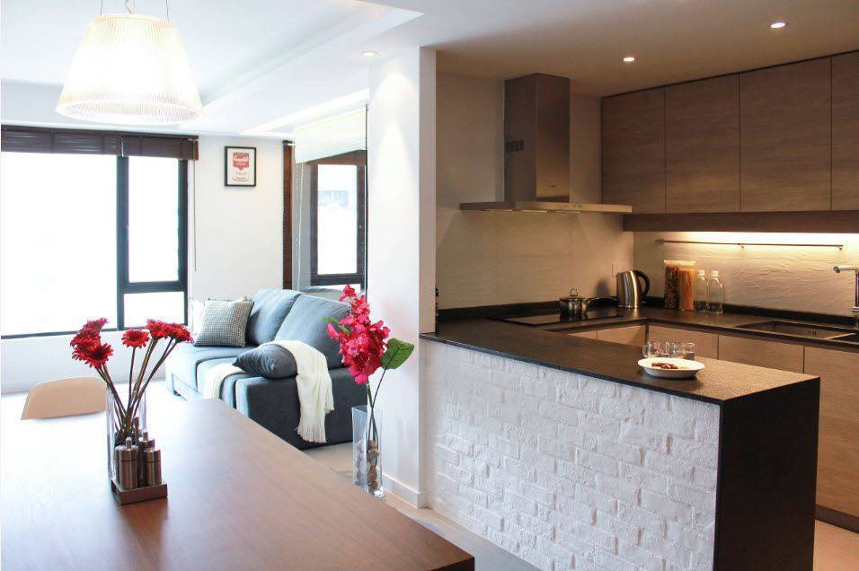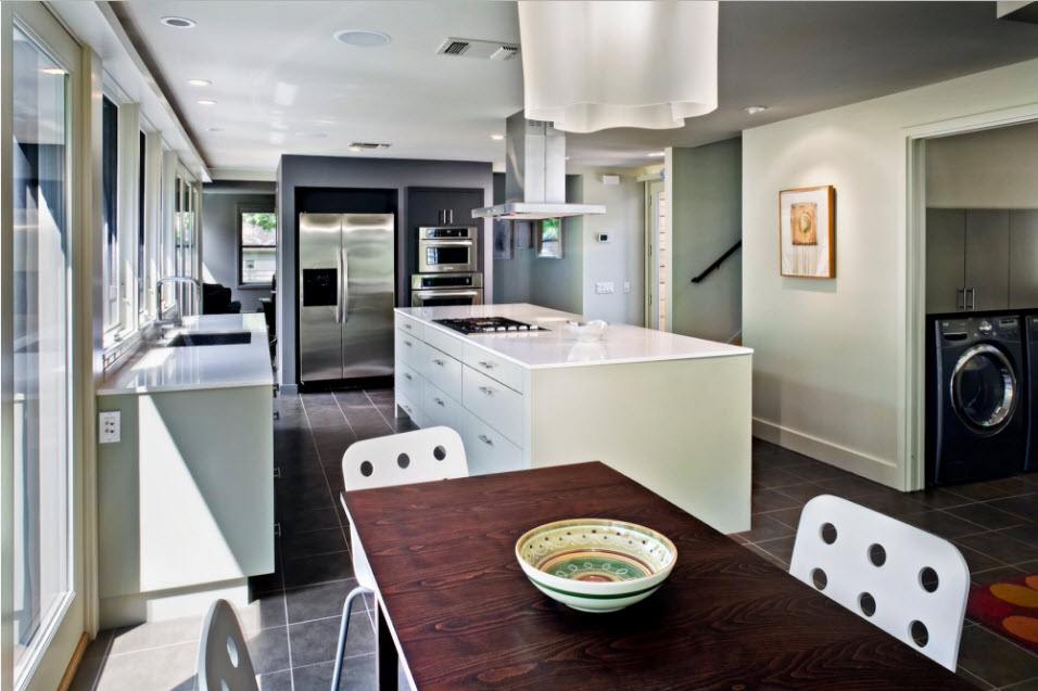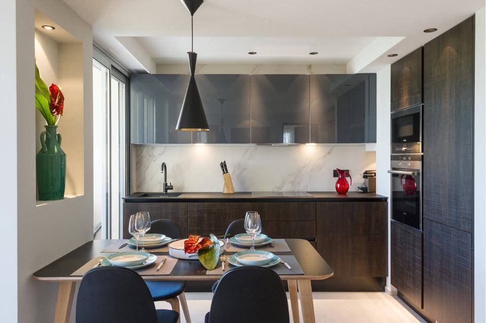 Воплотить в жизнь такой дизайн просто, он смотрится гармонично и со вкусом. Вся мебель и бытовая техника располагаются вдоль одной из стен. Это позволяет освободить достаточно места для столовой зоны. Иногда подобная планировка единственный выход в случае, если комната очень длинная и узкая.
