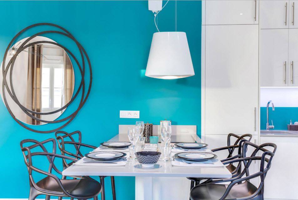 Настоящей изюминкой интерьера станет зеркало необычной формы или расцветки. Белоснежная кухня в отражении окажется розовой, изумрудной, желтой или синей.