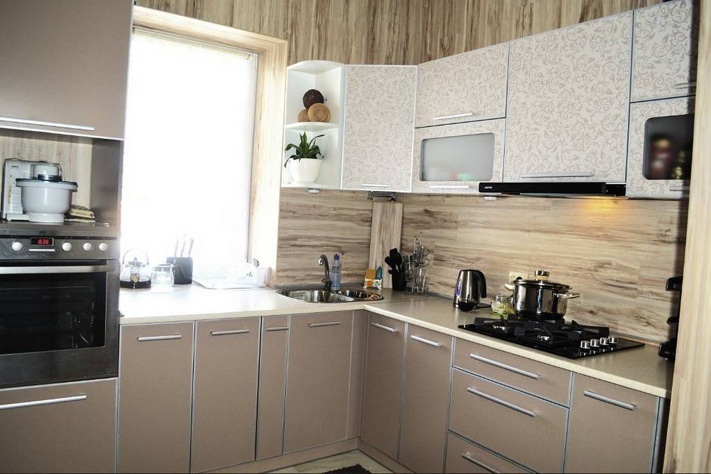 - ПВХ-панели. Практичный материал, устойчивый к микроклимату кухни и разнообразный по внешнему виду. Вы всегда подберете вариант нужного цвета и фактуры под любой дизайнерский стиль.