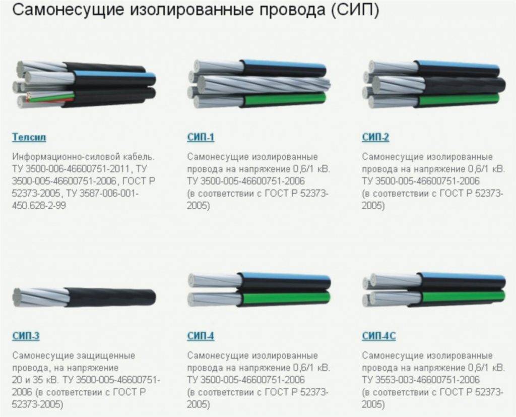 Согласно ГОСТ 31946-2012 «Провода самонесущие изолированные и защищенные для воздушных линий электропередачи» кабель СИП выполняется из термопластичного светостабилизированного полиэтилена, а несущие жилы из алюминиевого сплава и подразделяется на следующие типы: