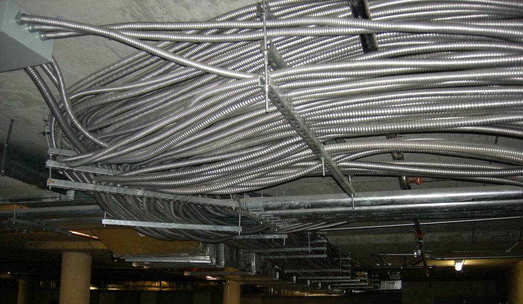 Их устанавливают на металлическую или пластиковую обрешетку. Такая конструкция обеспечивает легкий монтаж проводки, позволяет получать доступ к кабелям в любой момент. Провода крепят как к плитам перекрытия, так и к обрешетке.