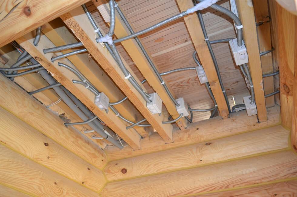 На фото прокладка коммуникаций по деревянному потолку с применением металлических труб