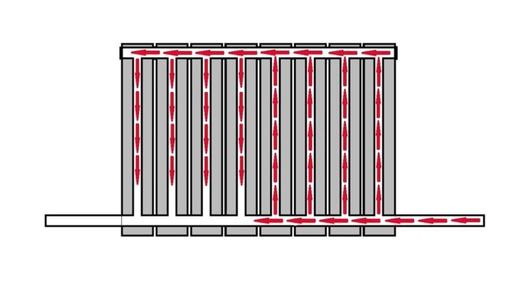 Горячая вода имеет меньшую плотность и за счет этого должна подниматься вверх, а уже остывший теплоноситель опускаться вниз. Благодаря этой циркуляции происходит замена теплоносителя более горячим. Но по подсчетам производителей, при таком виде соединения батарей от 10 до 20 процентов теплоносителя просто протекает мимо вертикальных трубопроводов и не участвуют в теплообмене. Это происходит из-за того, что узкий канал плохо способствует эффективной циркуляции и процесс вытеснения остывшего теплоносителя может происходить очень медленно. Естественно, что при отложении на вертикальных трубопроводов радиатора солей и накипи скорость циркуляции будет ухудшаться и эффективность падать еще больше.