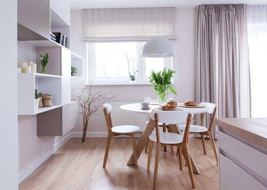 Ограниченное пространство требует оригинальных решений. Мебель должна быть эргономичной и удобной. Оптимально, чтобы стулья и табуреты можно было плотно задвинуть под обеденный стол.