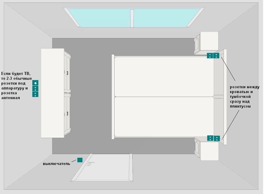При планировании схемы электропитания в спальне следует руководствоваться принципами эргономичности и достаточности. В идеале – хоть немного смотреть в будущее, учитывая возможные перестановки. И самое главное: лучше больше, чем меньше.
