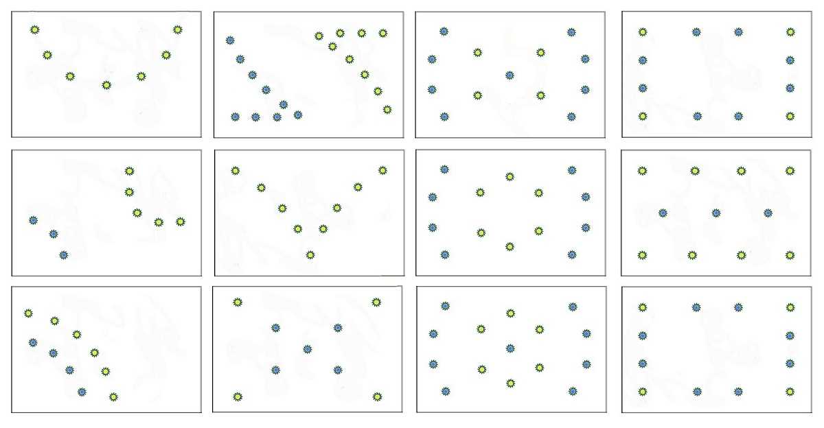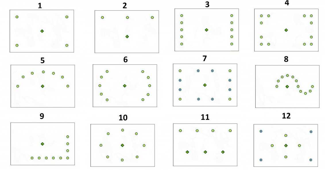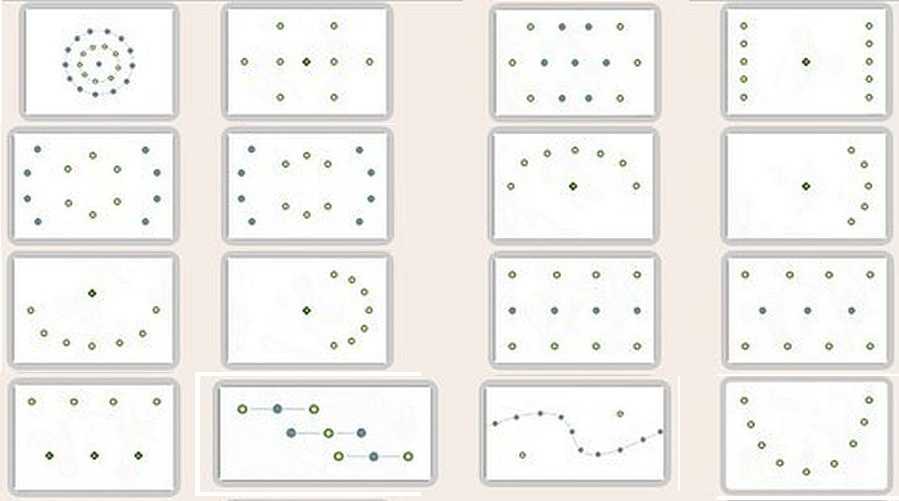 В схемах 5, 6, 10 используются дуги, окружности и овалы. Это тоже довольно распространенный тип расположение светильников на потолке. Он хорошо вписывается в спальни, гостиные, детские, если в них стиль оформления с налетом романтики.