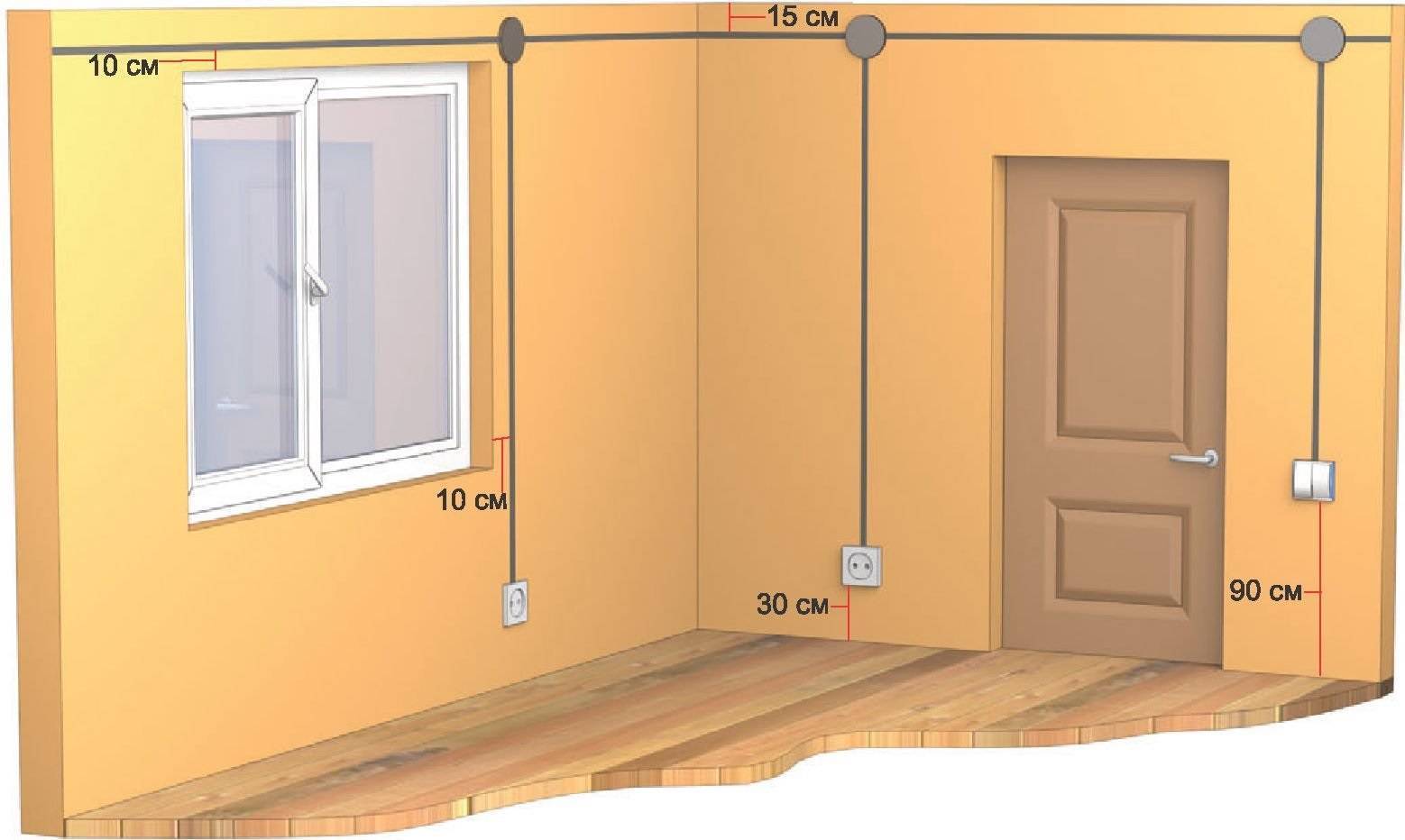 При монтаже электропроводки своими руками необходимо прокладывать ее параллельно или перпендикулярно поверхностям пола и потолка. Расстояние от потолка до прокладываемых кабелей должно быть равно 20-30 см. Коробки, питающие выключатель или розетку, желательно располагать над ними. Делается это для того, чтобы коробку можно было без труда найти. Чтобы не портить дизайн помещений, их обычно замуровывают вровень с поверхностью стен, а затем заклеивают обоями. Коробка, питающая розетку и находящаяся над ней, при необходимости будет найдена быстрее, чем расположенная произвольно.