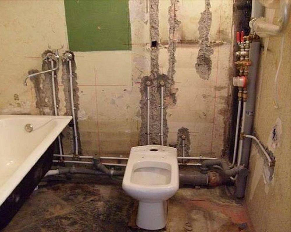 Чтобы скрыть трубопровод в санузле здания, стены которого не пригодны для устройства каналов, можно поверх разводки положить стяжку, провести трубы за обшивкой стены или под потолком.