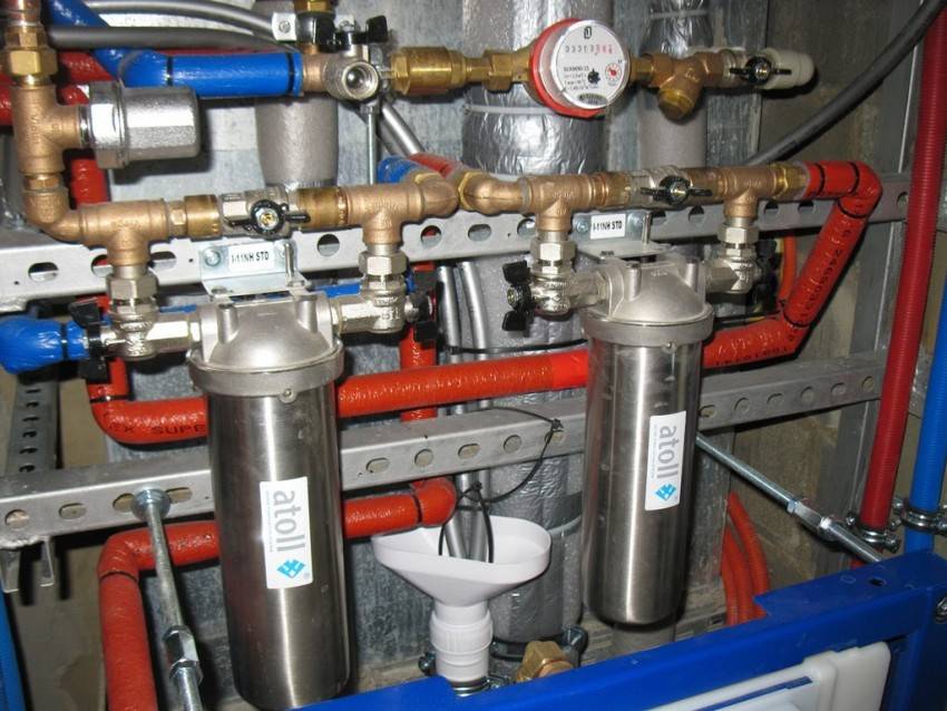 Сразу за системой фильтрации устанавливается тройник для разделения водопровода на горячее и холодное водоснабжение.