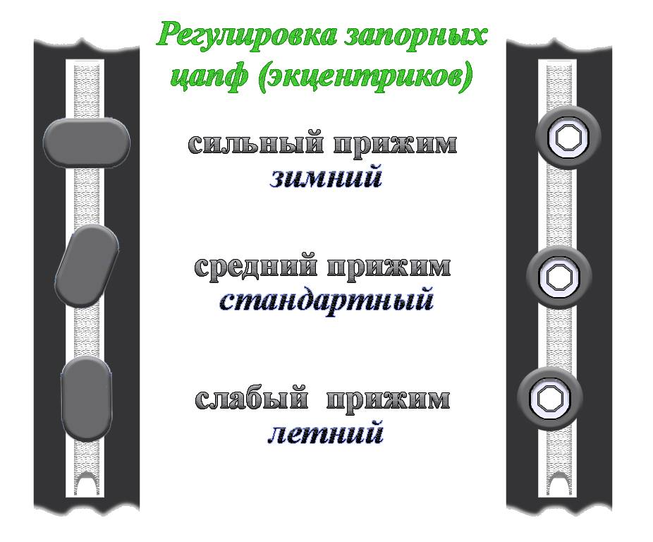 Цапфы могут быть как круглыми, так и овальными. В таких случаях используемый режим определяется с помощью положения эксцентрика. Если он установлен вертикально, окна настроены на летний сезон, если горизонтально — на зимний.