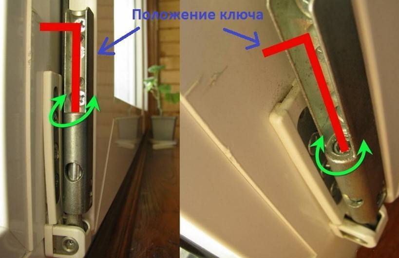 Главное верно найти расположение этих специальных отверстий: снизу они расположены с наружной и внутренней стороны, поэтому положение окна можно изменять из разных точек. Провернув ключ в направлении по часовой стрелке, оконная створка переместится в противоположную самой петле сторону. В другом направлении наоборот сместится в сторону петли.
