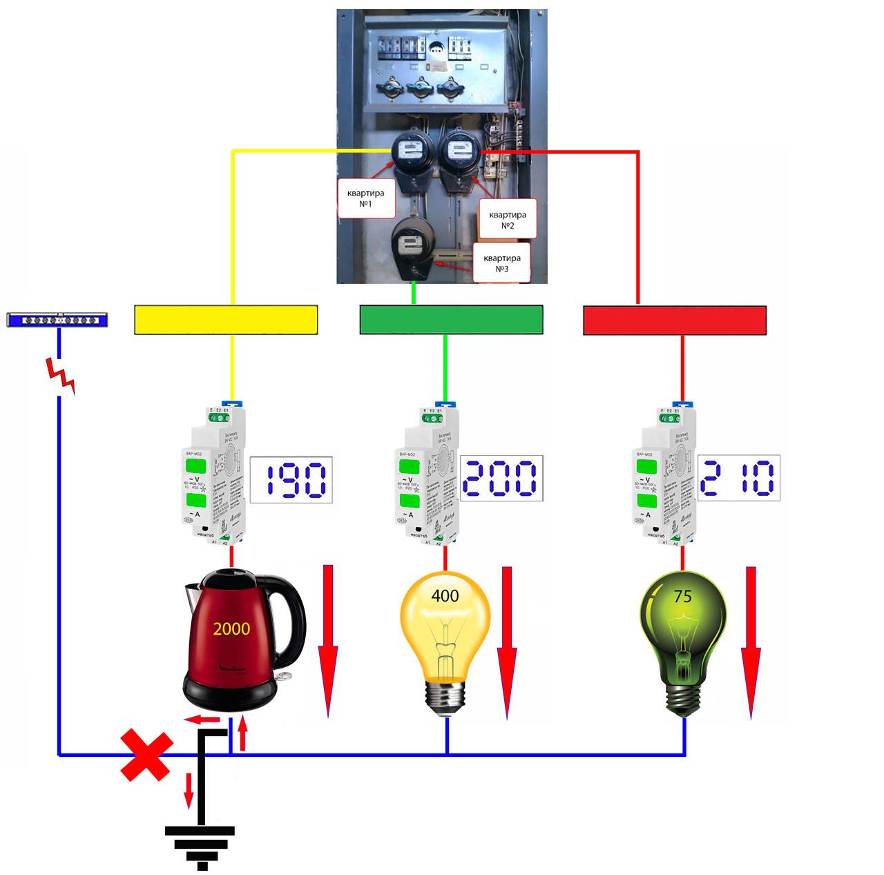 - Выход на квартиру. Этот провод отключится при скачке или просадке напряжения.