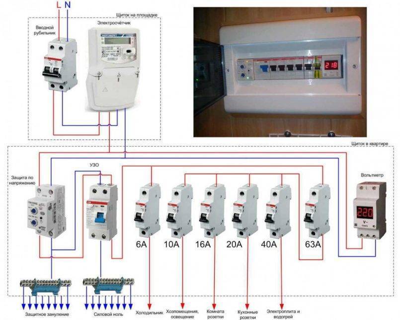 В случае с монтажом в щиток, прибор устанавливается после счетчика, разрывая фазу. Нагрузка может идти как напрямую через реле контроля напряжения, так и через магнитный пускатель. Обычно в жилых домах применяют первый вариант.