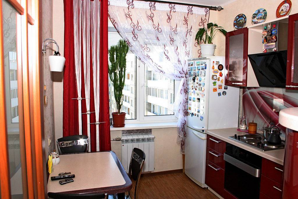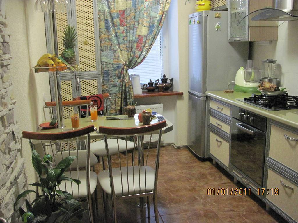 Холодильник при наличии свободного места следует переставить в коридор. Можно также избавиться от обеденного стола, заменив его столешницей. Для этого необходимо присоединить ее к подоконнику. Получиться своего рода мини-барная стойка.