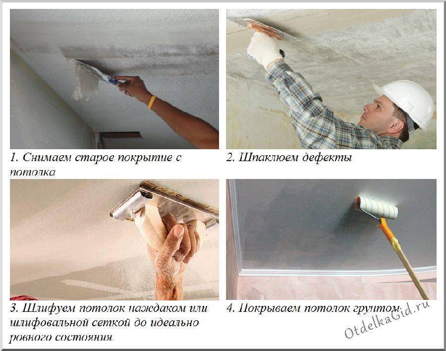 Технология работ по отделке потолка может изменяться в зависимости от изначального покрытия поверхности. Кроме того, изначальная обработка поверхности под отделку будет зависеть и от того, на какой период планируется сохранить ремонт. Если не требуется большого срока службы, можно сократить этап подготовительных работ.